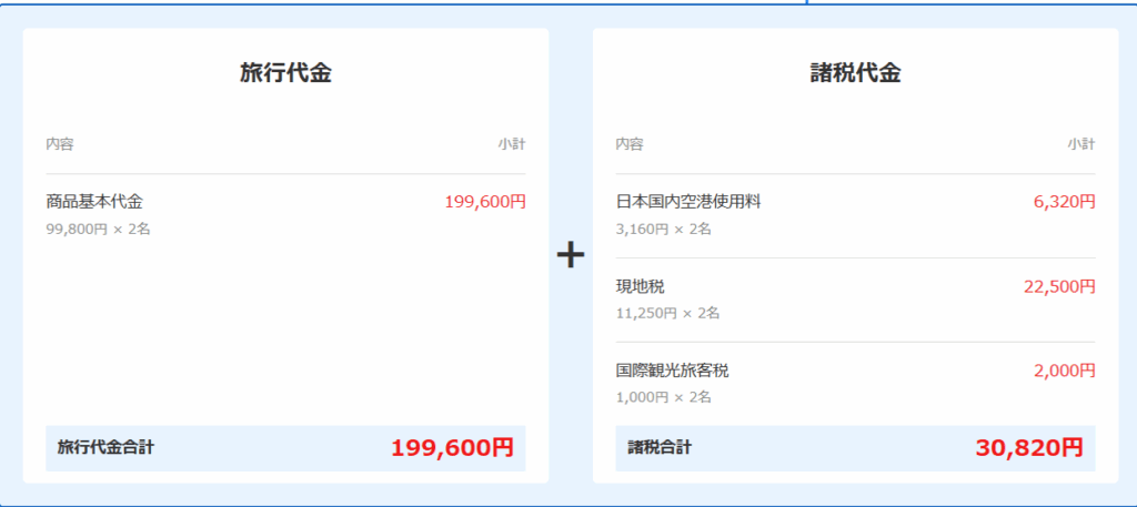 基本的に、ツアー料金の場合は税金などの諸費用が15,000円~16,000円程度かかります。(現地税が為替レートで多少の変動があります。)セール価格で燃油サーチャージ込み99,800円と謳っていても、空港諸税としてプラスになります。