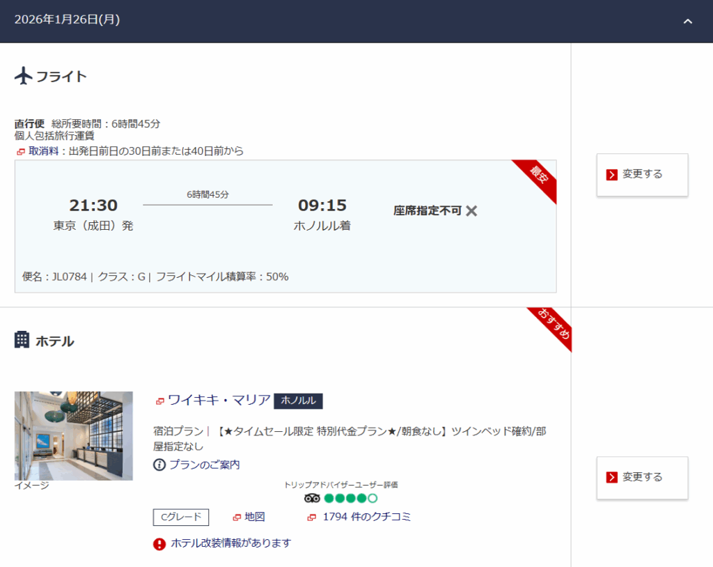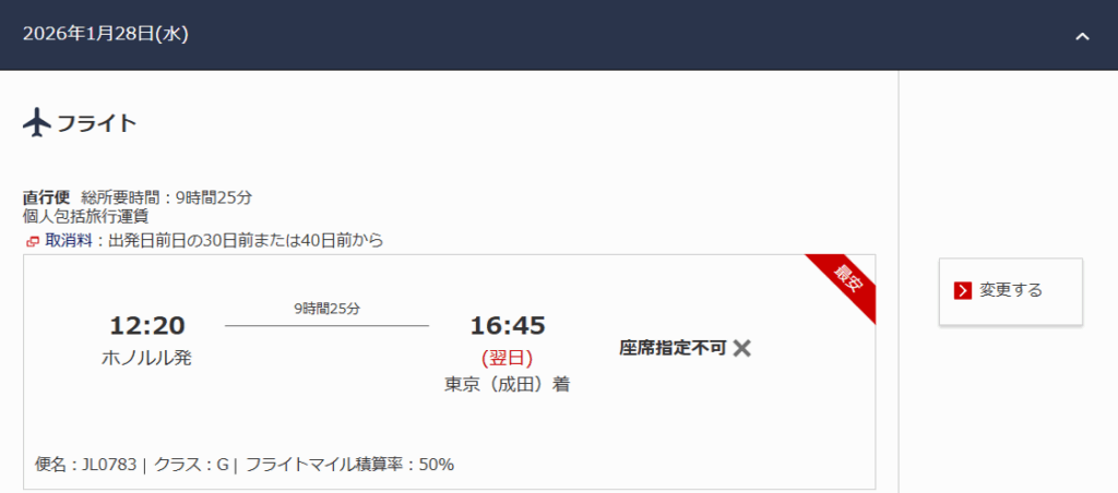 エアラインはすべて日系航空会社利用(JAL・ANA)という安心感。ただし、並び席は追加料金がかかります。